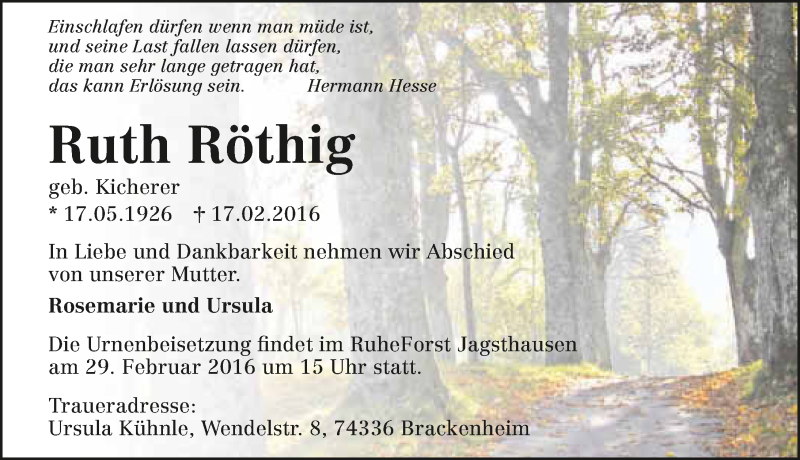 Hier finden Sie alle Traueranzeigen aus der Zeitung, die bisher für Ruth Röthig erschienen sind. Weitere Traueranzeigen, die in der Zeitung erscheinen, werden hier ebenfalls aufgelistet
