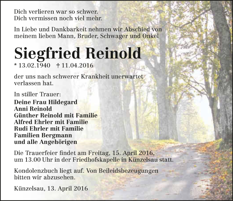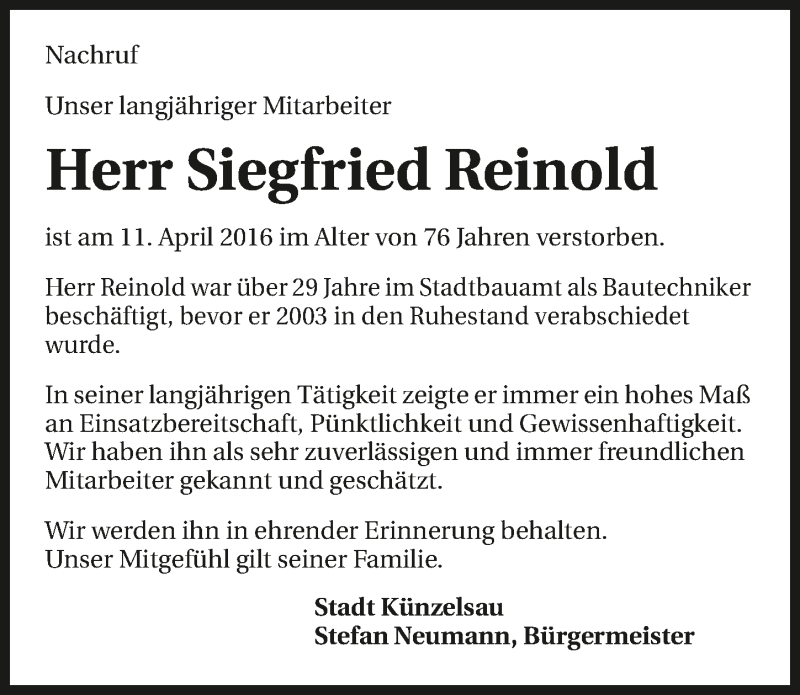 Hier finden Sie alle Traueranzeigen aus der Zeitung, die bisher für Siegfried Reinold erschienen sind. Weitere Traueranzeigen, die in der Zeitung erscheinen, werden hier ebenfalls aufgelistet