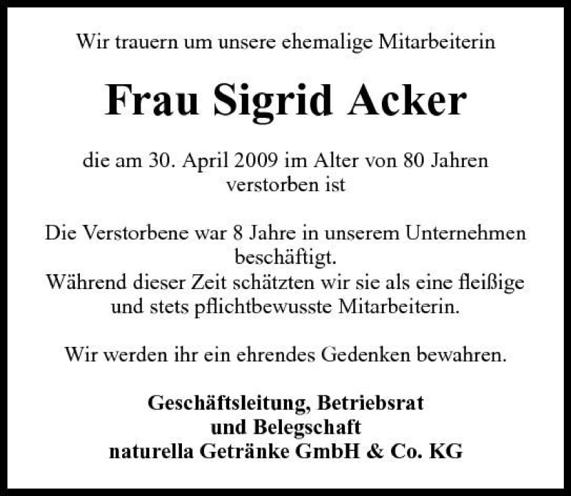 Hier finden Sie alle Traueranzeigen aus der Zeitung, die bisher für Sigrid Acker erschienen sind. Weitere Traueranzeigen, die in der Zeitung erscheinen, werden hier ebenfalls aufgelistet