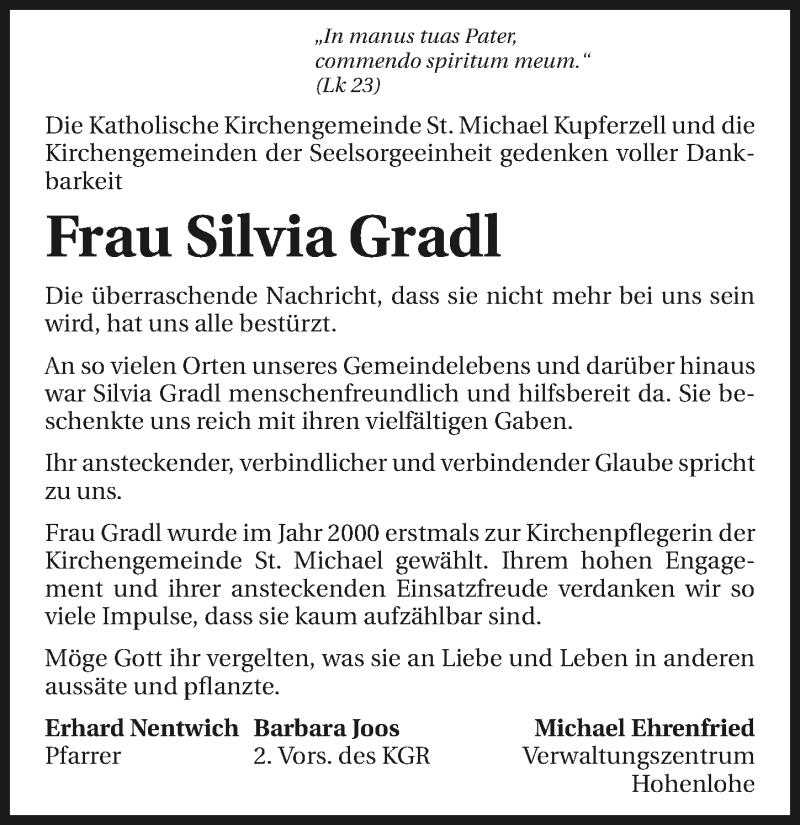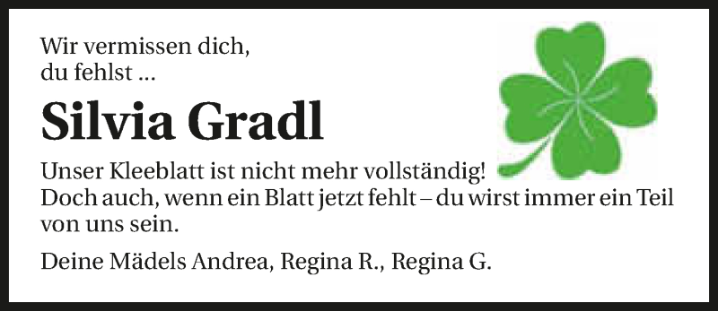 Hier finden Sie alle Traueranzeigen aus der Zeitung, die bisher für Silvia Gradl erschienen sind. Weitere Traueranzeigen, die in der Zeitung erscheinen, werden hier ebenfalls aufgelistet