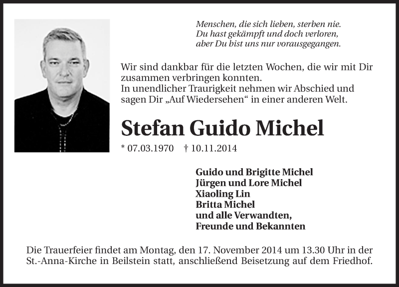 Hier finden Sie alle Traueranzeigen aus der Zeitung, die bisher für Stefan Guido Michel erschienen sind. Weitere Traueranzeigen, die in der Zeitung erscheinen, werden hier ebenfalls aufgelistet