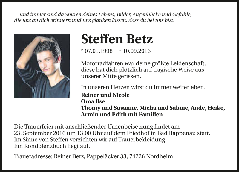 Hier finden Sie alle Traueranzeigen aus der Zeitung, die bisher für Steffen Betz erschienen sind. Weitere Traueranzeigen, die in der Zeitung erscheinen, werden hier ebenfalls aufgelistet