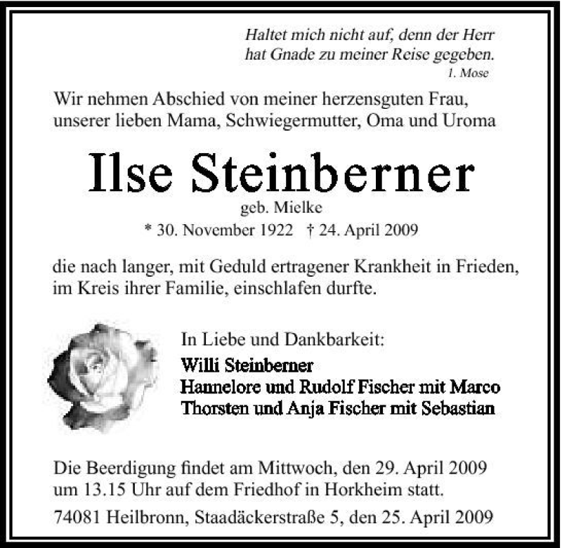 Hier finden Sie alle Traueranzeigen aus der Zeitung, die bisher für Steinberner Steinberner erschienen sind. Weitere Traueranzeigen, die in der Zeitung erscheinen, werden hier ebenfalls aufgelistet