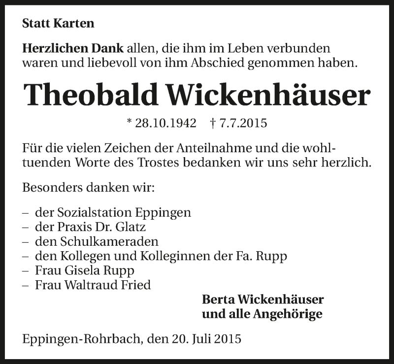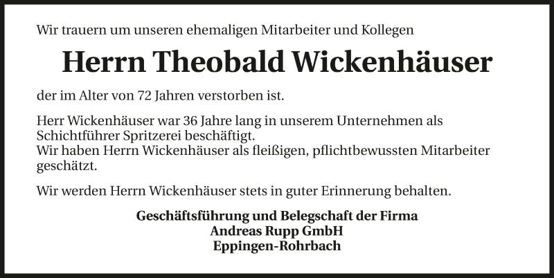 Hier finden Sie alle Traueranzeigen aus der Zeitung, die bisher für Theobald Wickenhäuser erschienen sind. Weitere Traueranzeigen, die in der Zeitung erscheinen, werden hier ebenfalls aufgelistet