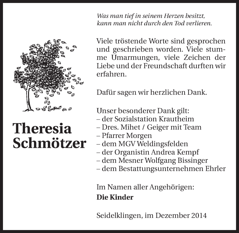 Hier finden Sie alle Traueranzeigen aus der Zeitung, die bisher für Theresia Schmötzer erschienen sind. Weitere Traueranzeigen, die in der Zeitung erscheinen, werden hier ebenfalls aufgelistet