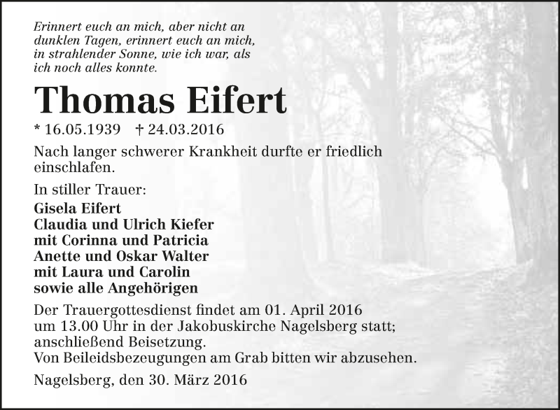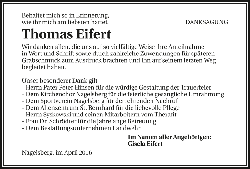 Hier finden Sie alle Traueranzeigen aus der Zeitung, die bisher für Thomas Eifert erschienen sind. Weitere Traueranzeigen, die in der Zeitung erscheinen, werden hier ebenfalls aufgelistet