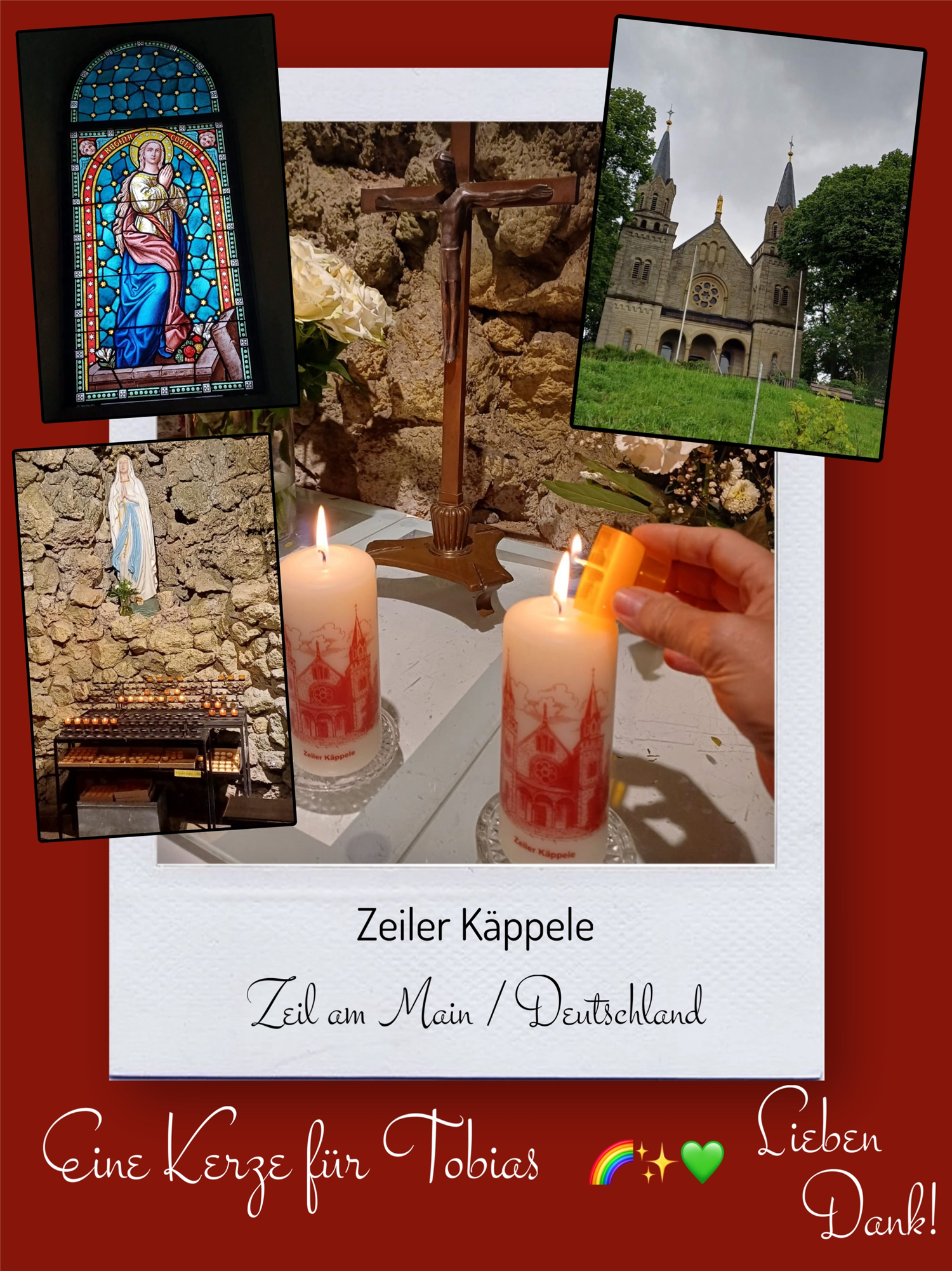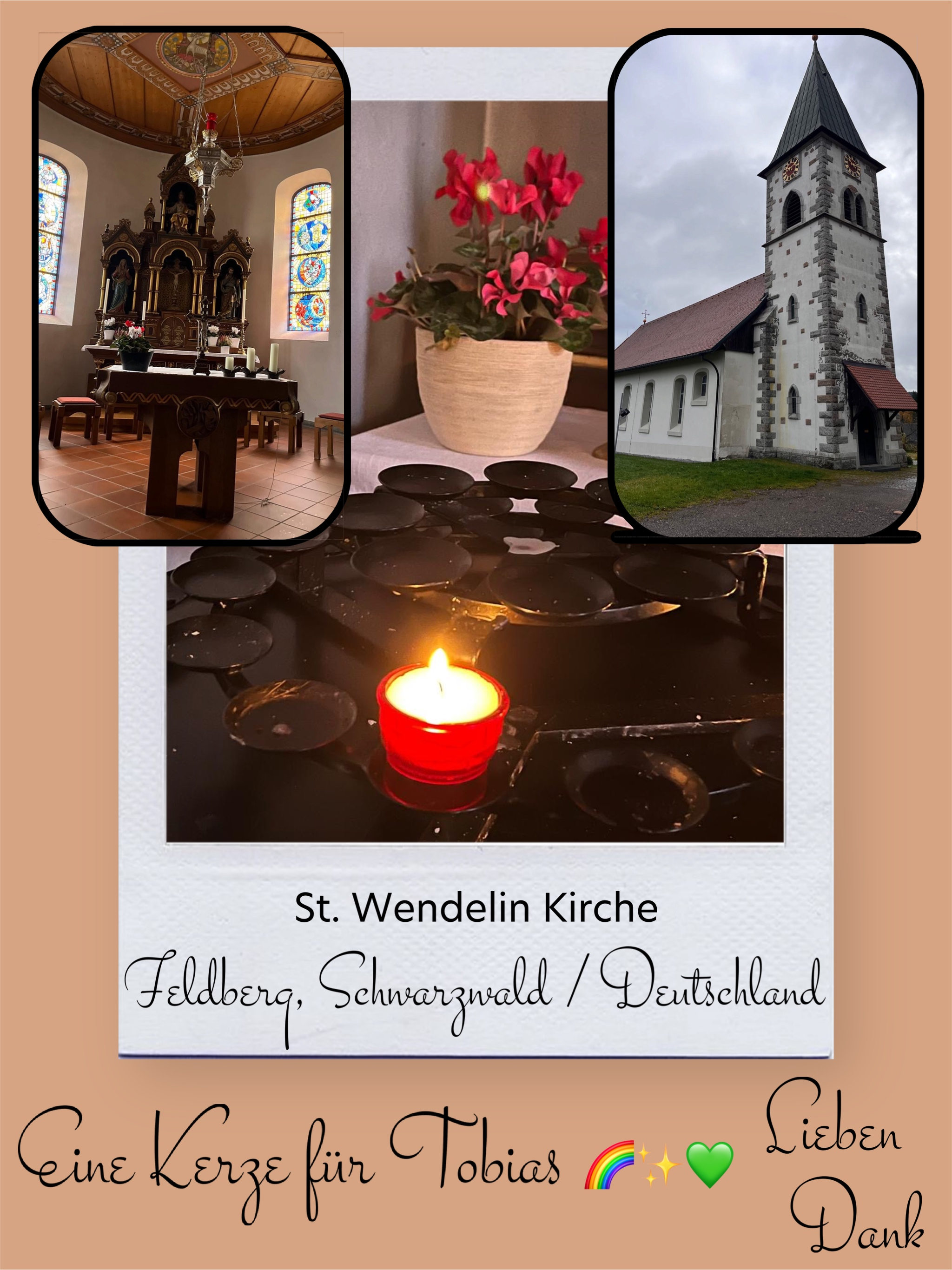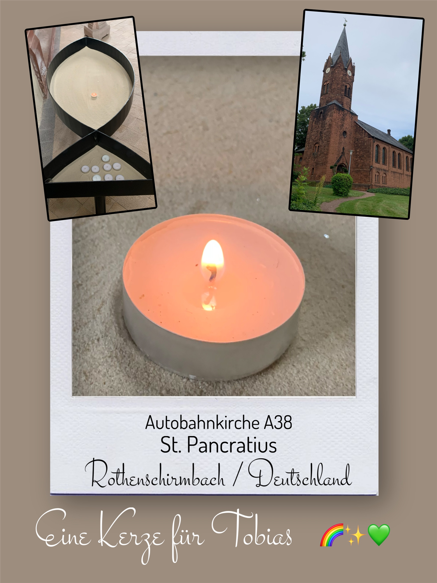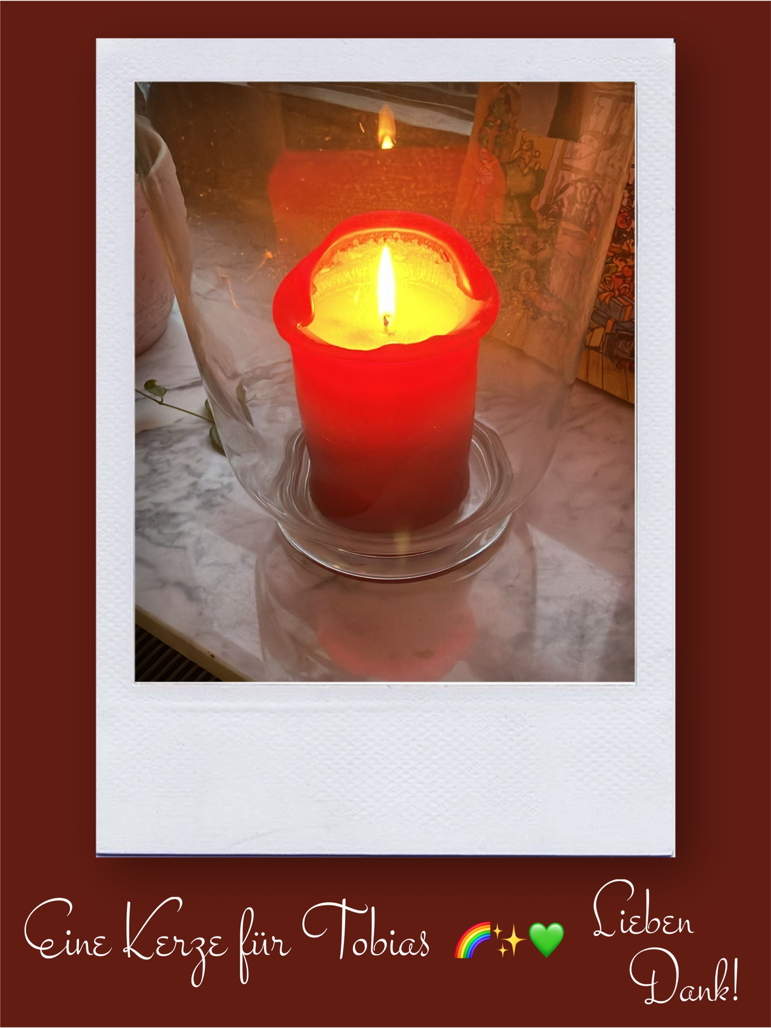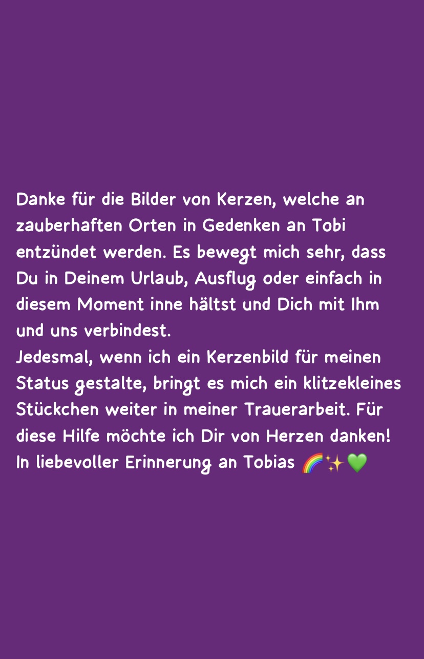Bildersammlung von Kerzen, die im Namen und Gedenken an Tobias angezündet wurden. Von lieben Verwandten, Freunden, Bekannten und einfach allen Menschen, die Tobias nahe standen und an ihn denken. Herzlichen Dank euch allen! In liebevoller Erinnerung an Tobias