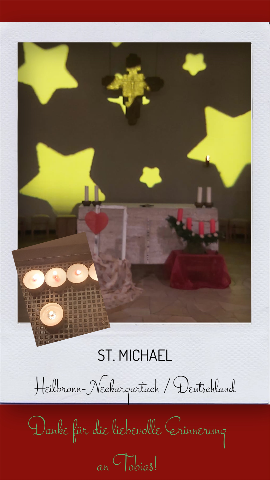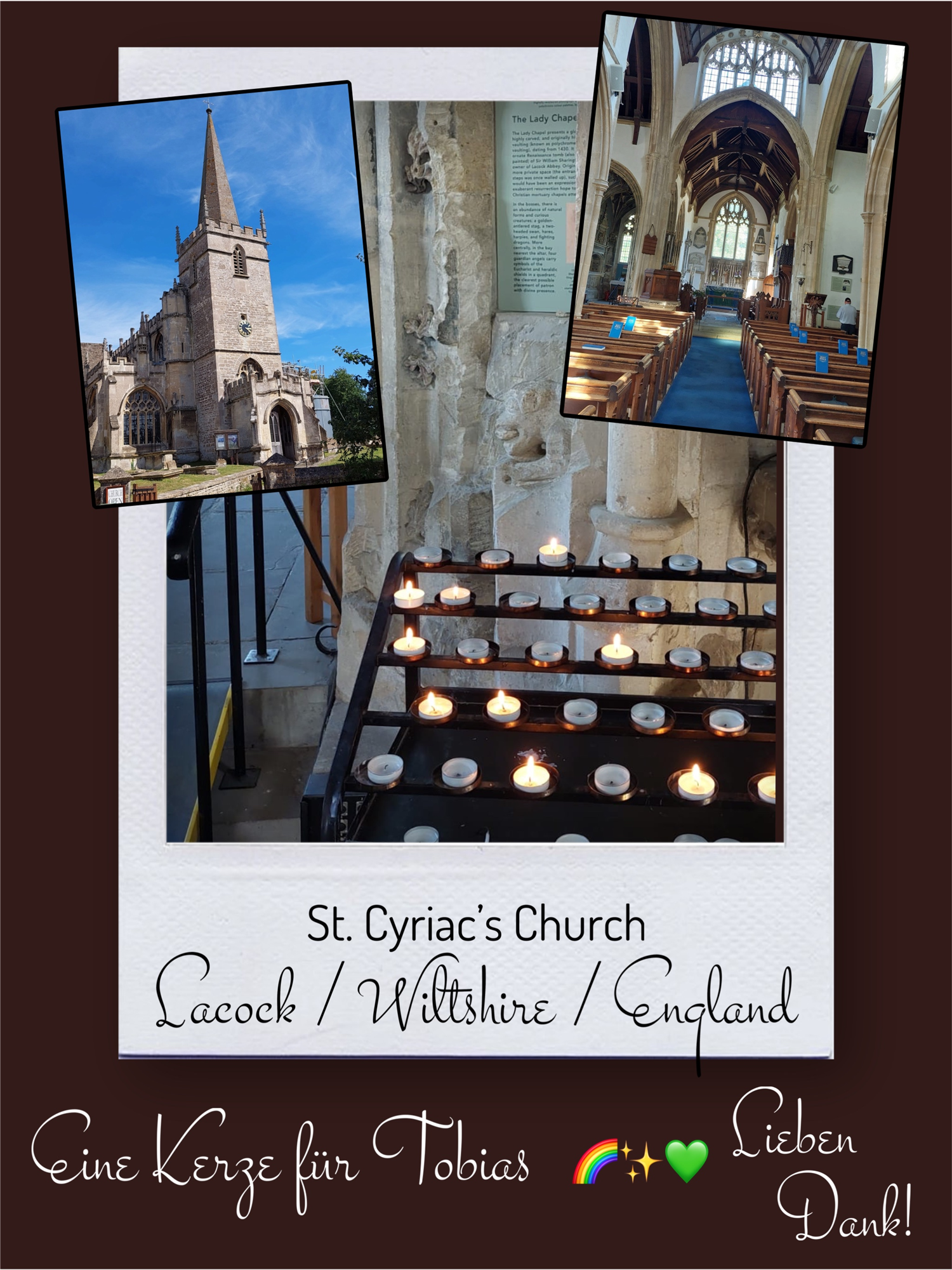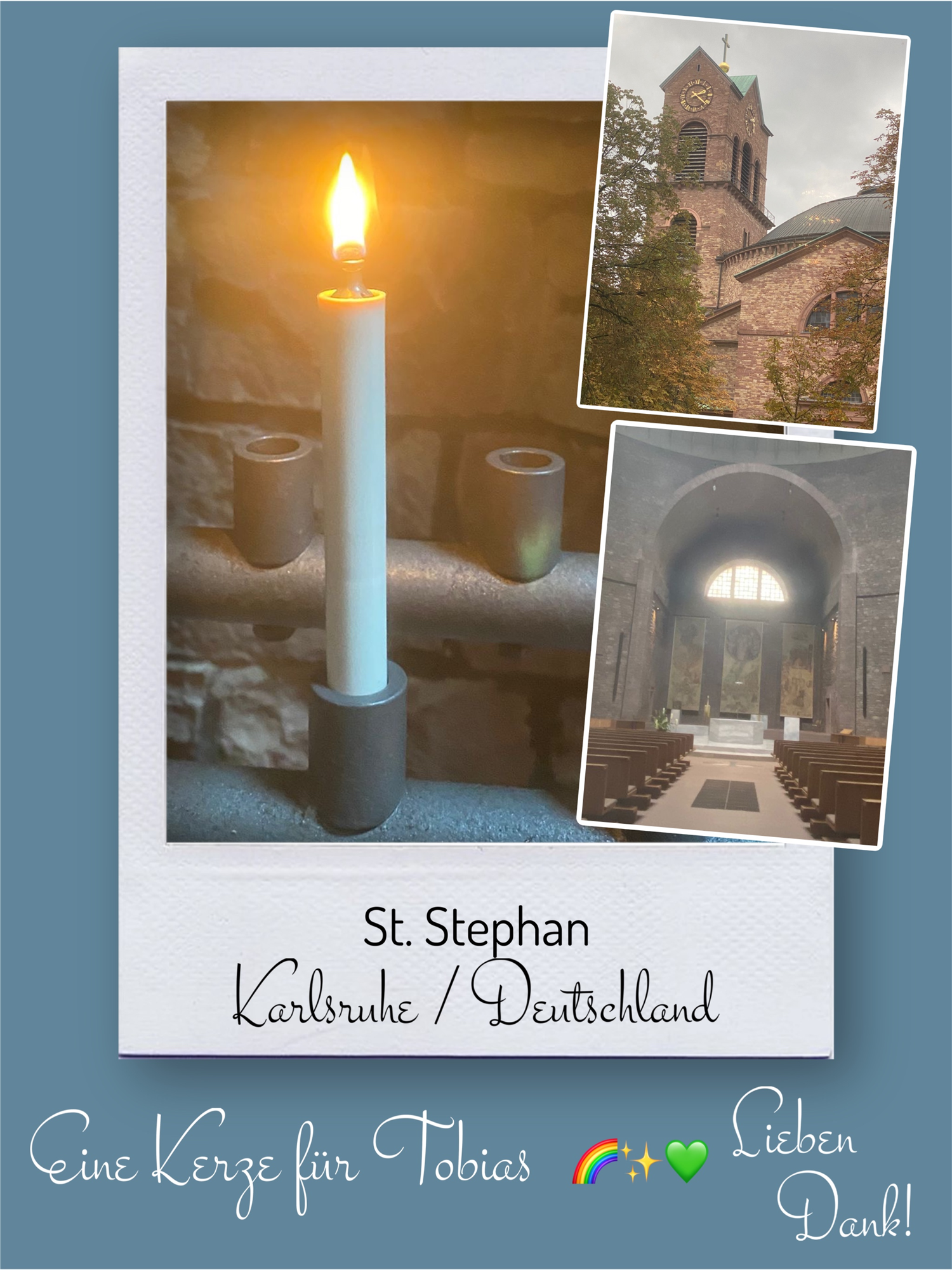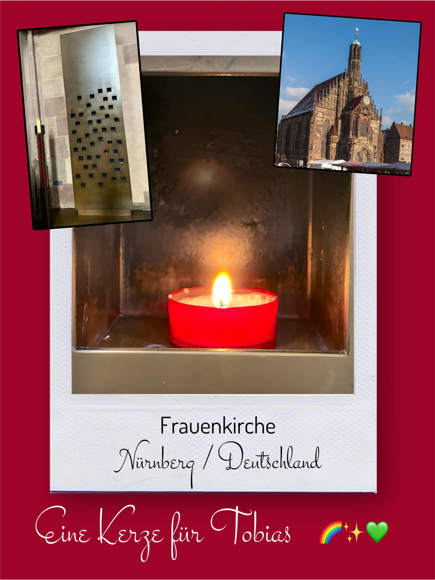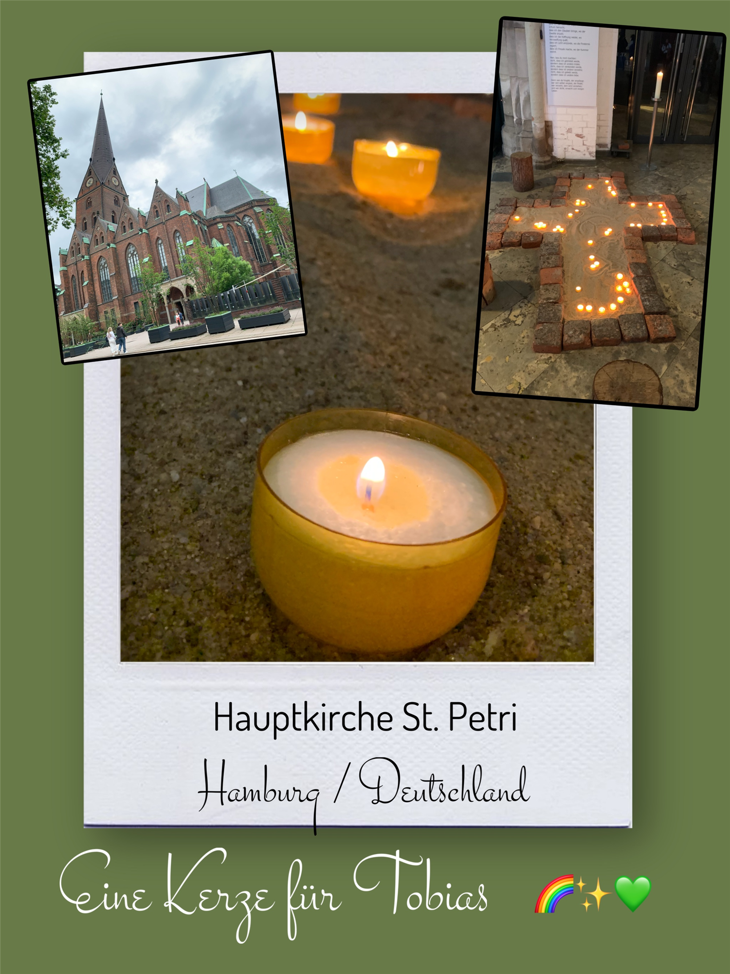 Bildersammlung von Kerzen, die im Namen und Gedenken an Tobias angezündet wurden. Von lieben Verwandten, Freunden, Bekannten und einfach allen Menschen, die Tobias nahe standen und an ihn denken. Herzlichen Dank euch allen! In liebevoller Erinnerung an Tobias