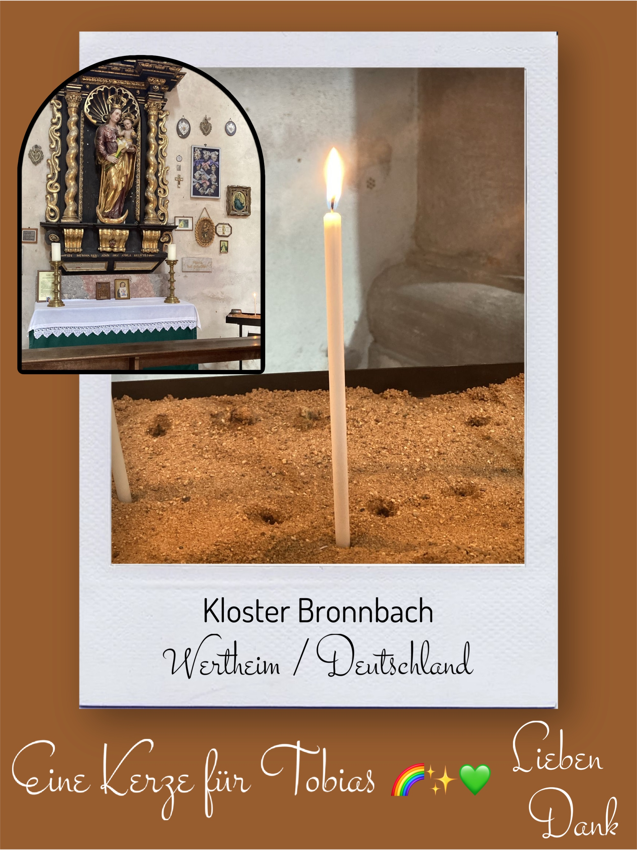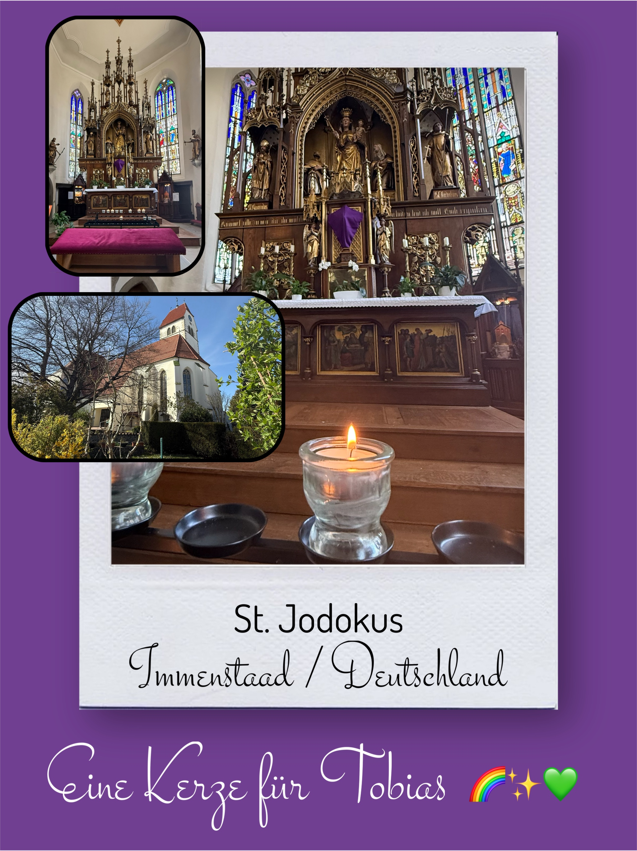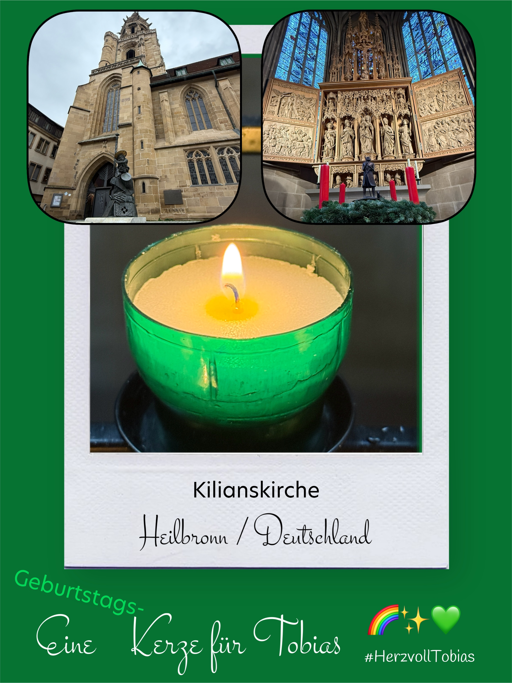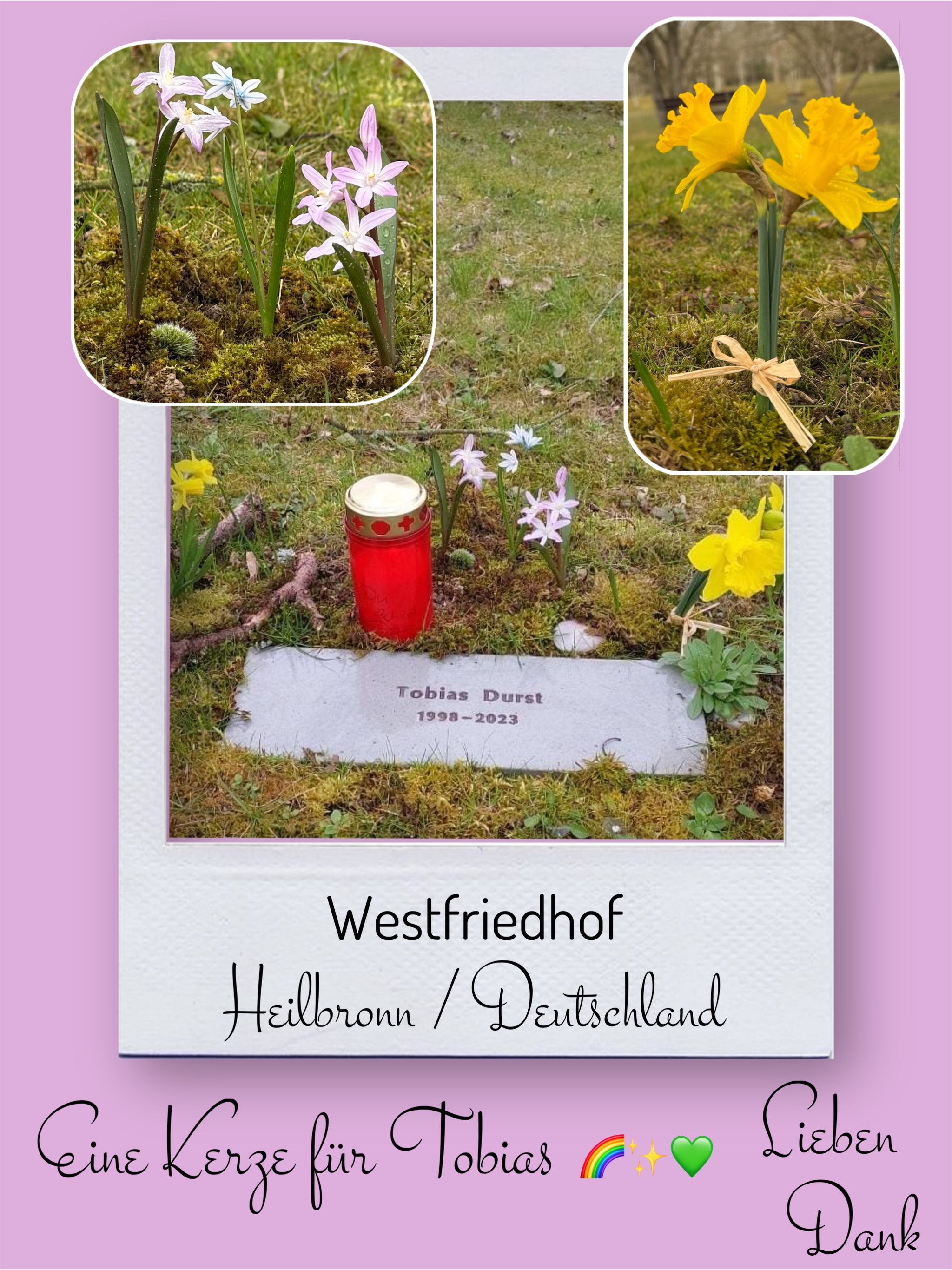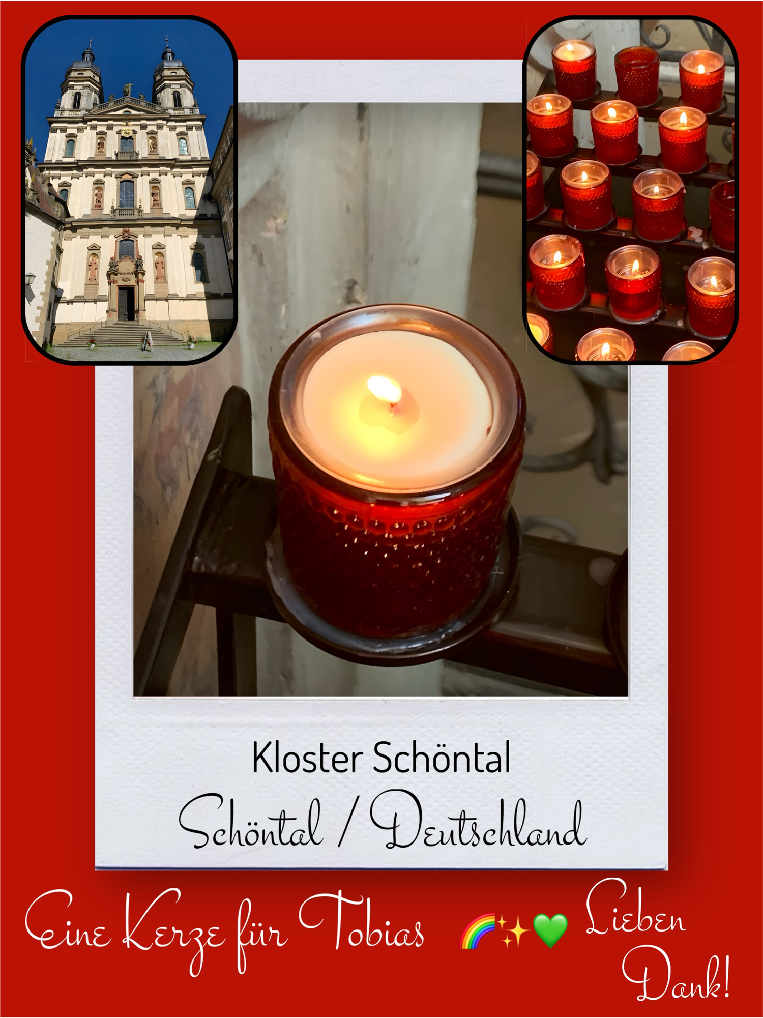 Bildersammlung von Kerzen, die im Namen und Gedenken an Tobias angezündet wurden. Von lieben Verwandten, Freunden, Bekannten und einfach allen Menschen, die Tobias nahe standen und an ihn denken. Herzlichen Dank euch allen! In liebevoller Erinnerung an Tobias