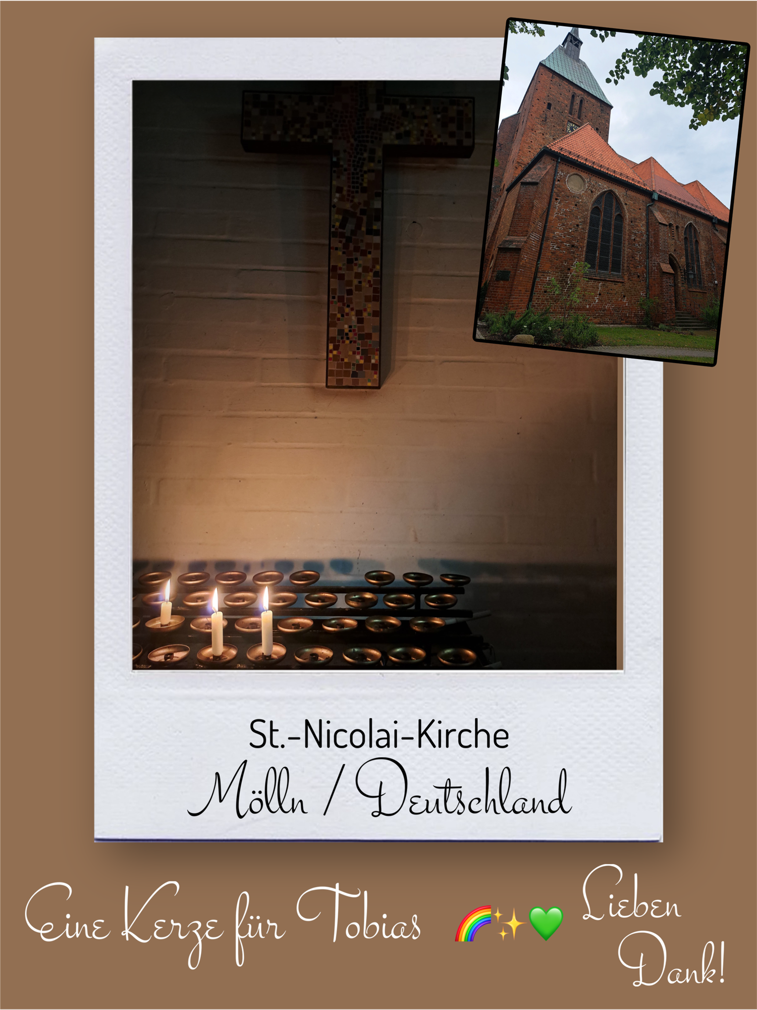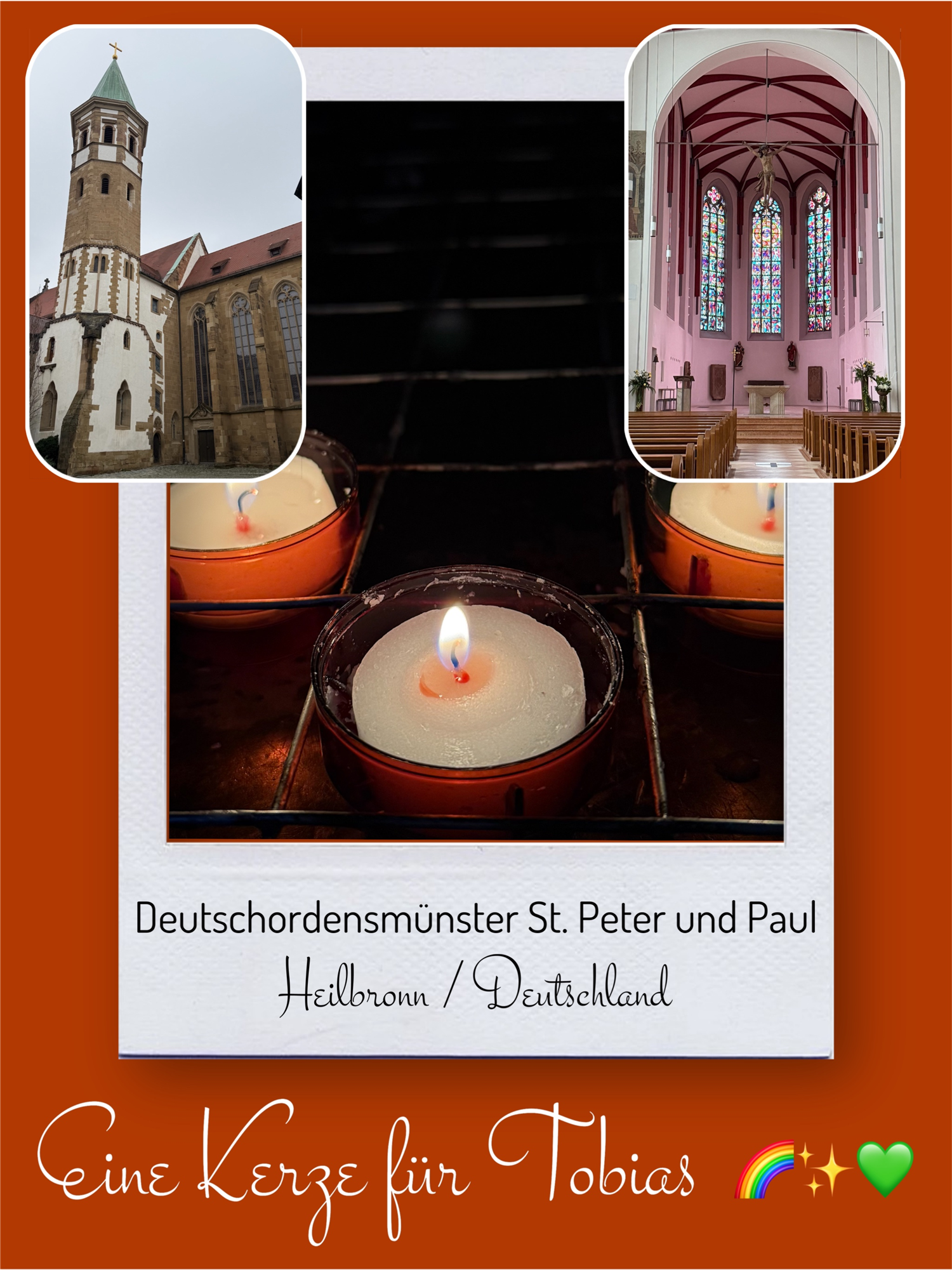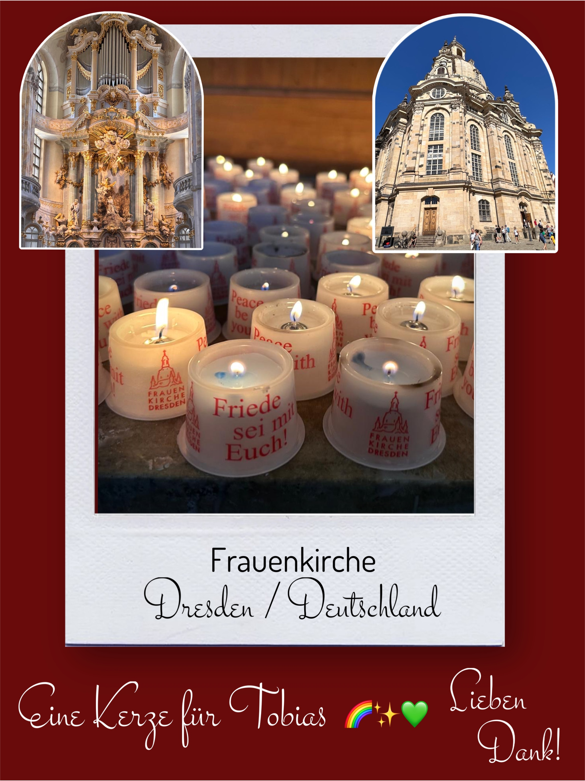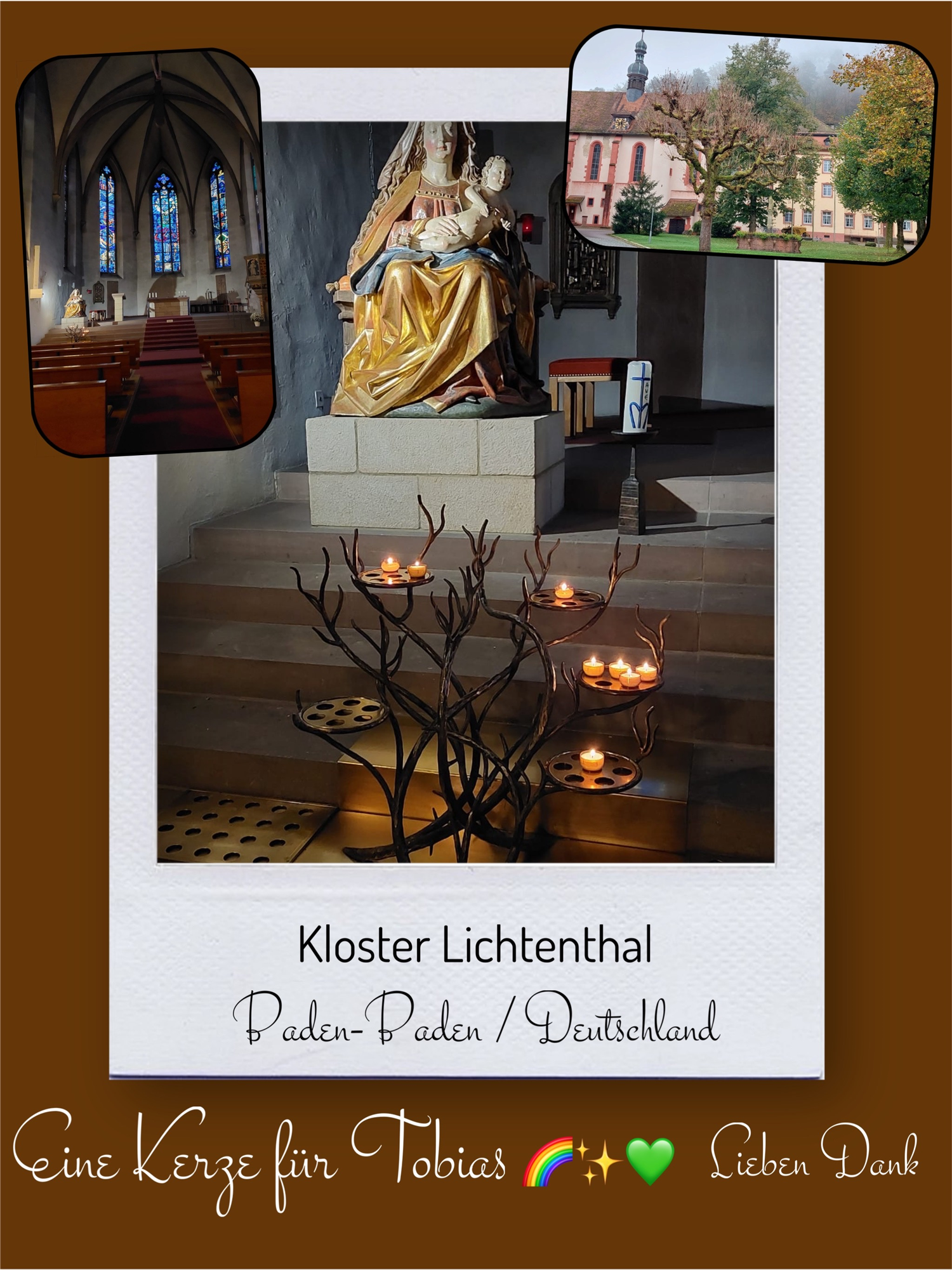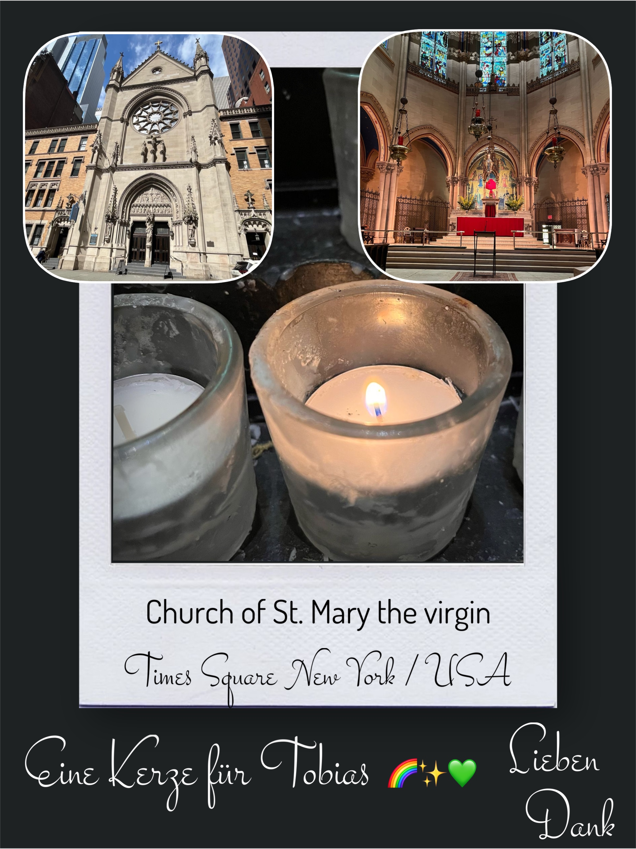 Bildersammlung von Kerzen, die im Namen und Gedenken an Tobias angezündet wurden. Von lieben Verwandten, Freunden, Bekannten und einfach allen Menschen, die Tobias nahe standen und an ihn denken. Herzlichen Dank euch allen! In liebevoller Erinnerung an Tobias