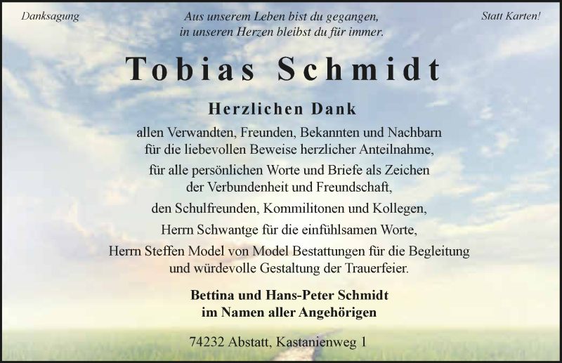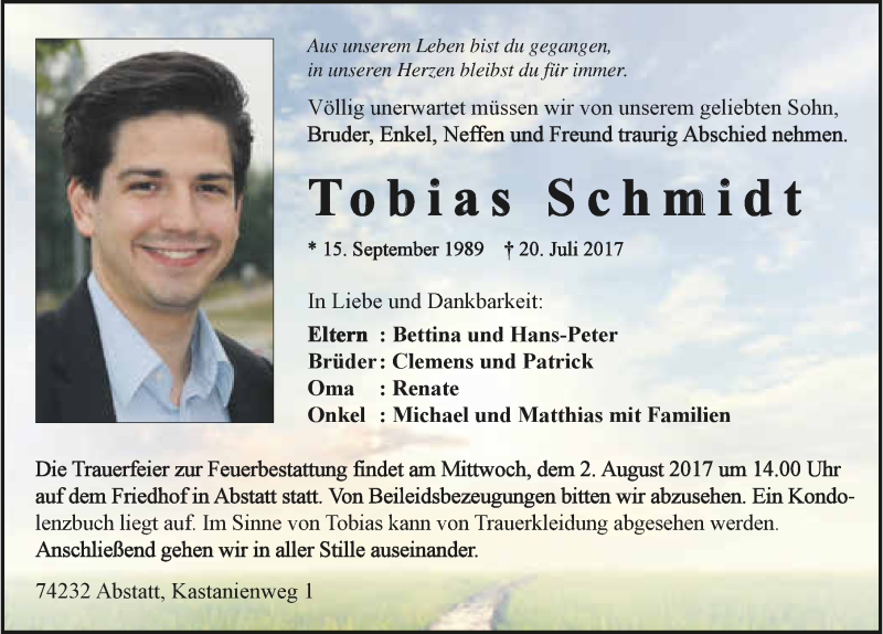 Hier finden Sie alle Traueranzeigen aus der Zeitung, die bisher für Tobias Schmidt erschienen sind. Weitere Traueranzeigen, die in der Zeitung erscheinen, werden hier ebenfalls aufgelistet