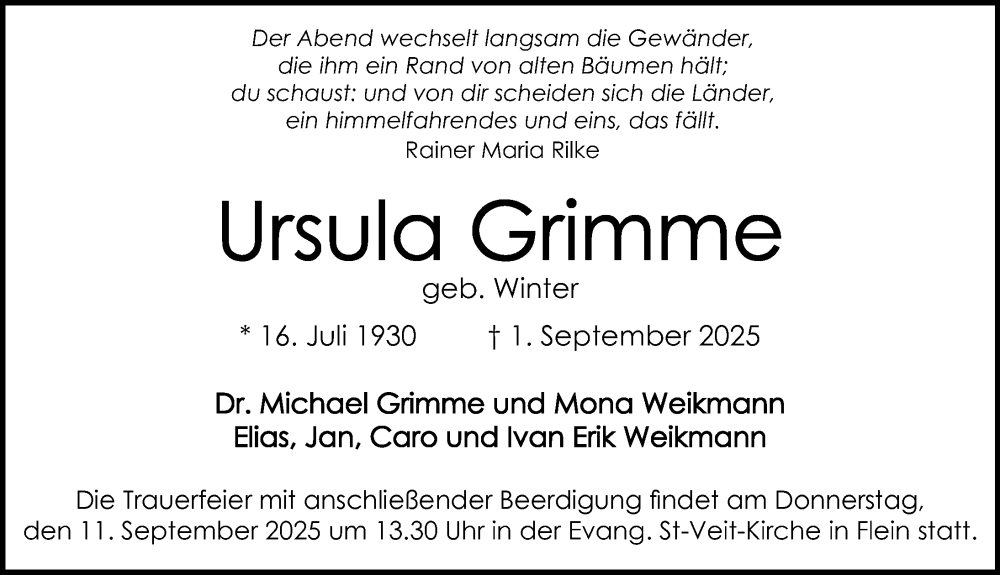 Hier finden Sie alle Traueranzeigen aus der Zeitung, die bisher für Ursula Grimme erschienen sind. Weitere Traueranzeigen, die in der Zeitung erscheinen, werden hier ebenfalls aufgelistet