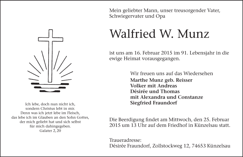 Hier finden Sie alle Traueranzeigen aus der Zeitung, die bisher für Walfried W. Munz erschienen sind. Weitere Traueranzeigen, die in der Zeitung erscheinen, werden hier ebenfalls aufgelistet