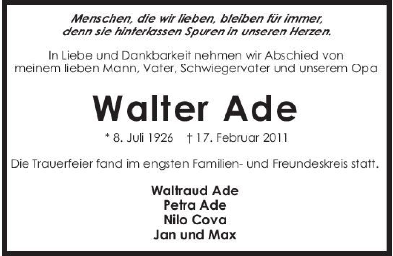 Hier finden Sie alle Traueranzeigen aus der Zeitung, die bisher für Walter Ade erschienen sind. Weitere Traueranzeigen, die in der Zeitung erscheinen, werden hier ebenfalls aufgelistet