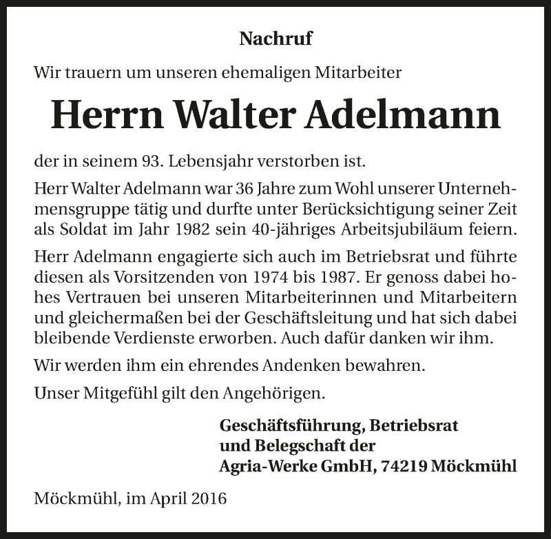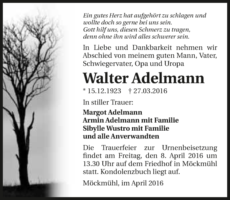 Hier finden Sie alle Traueranzeigen aus der Zeitung, die bisher für Walter Adelmann erschienen sind. Weitere Traueranzeigen, die in der Zeitung erscheinen, werden hier ebenfalls aufgelistet