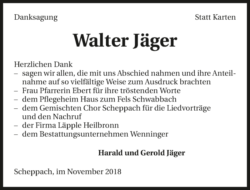 Hier finden Sie alle Traueranzeigen aus der Zeitung, die bisher für Walter Jäger erschienen sind. Weitere Traueranzeigen, die in der Zeitung erscheinen, werden hier ebenfalls aufgelistet