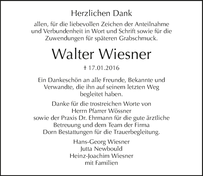 Hier finden Sie alle Traueranzeigen aus der Zeitung, die bisher für Walter Wiesner erschienen sind. Weitere Traueranzeigen, die in der Zeitung erscheinen, werden hier ebenfalls aufgelistet
