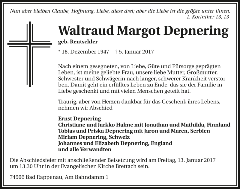 Hier finden Sie alle Traueranzeigen aus der Zeitung, die bisher für Waltraud Margot Depnering erschienen sind. Weitere Traueranzeigen, die in der Zeitung erscheinen, werden hier ebenfalls aufgelistet