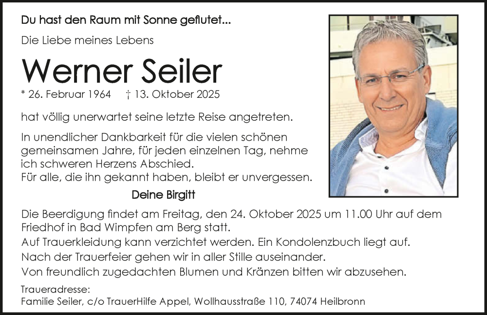 Hier finden Sie alle Traueranzeigen aus der Zeitung, die bisher für Werner Seiler erschienen sind. Weitere Traueranzeigen, die in der Zeitung erscheinen, werden hier ebenfalls aufgelistet
