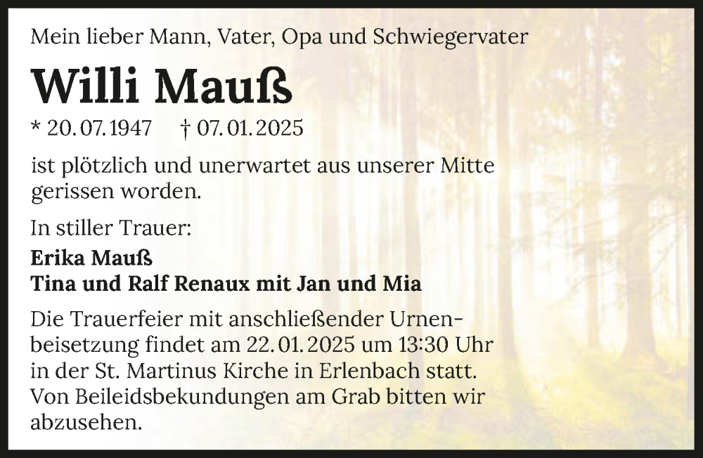 Hier finden Sie alle Traueranzeigen aus der Zeitung, die bisher für Willi Mauß erschienen sind. Weitere Traueranzeigen, die in der Zeitung erscheinen, werden hier ebenfalls aufgelistet