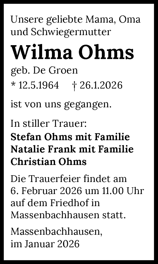 Hier finden Sie alle Traueranzeigen aus der Zeitung, die bisher für Wilma Ohms erschienen sind. Weitere Traueranzeigen, die in der Zeitung erscheinen, werden hier ebenfalls aufgelistet