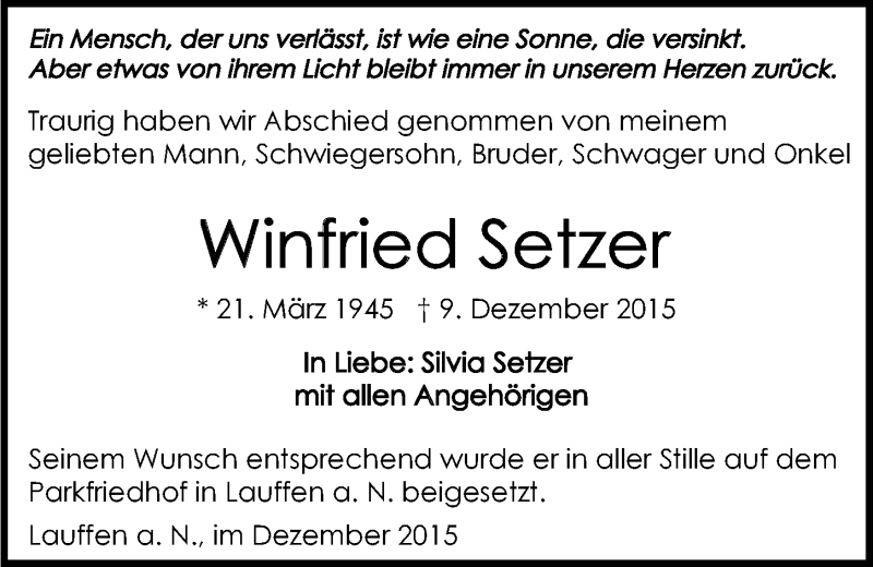 Hier finden Sie alle Traueranzeigen aus der Zeitung, die bisher für Winfried Setzer erschienen sind. Weitere Traueranzeigen, die in der Zeitung erscheinen, werden hier ebenfalls aufgelistet