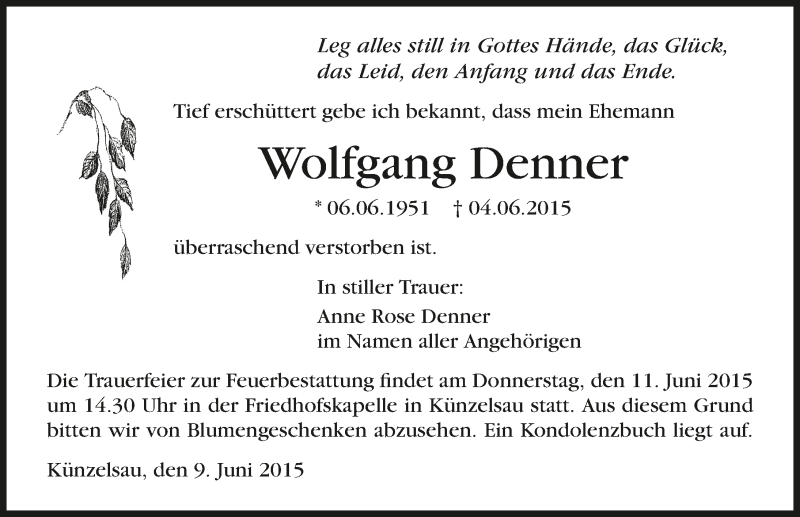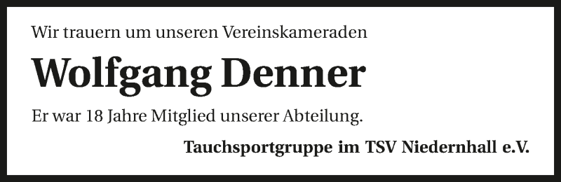 Hier finden Sie alle Traueranzeigen aus der Zeitung, die bisher für Wolfgang Denner erschienen sind. Weitere Traueranzeigen, die in der Zeitung erscheinen, werden hier ebenfalls aufgelistet