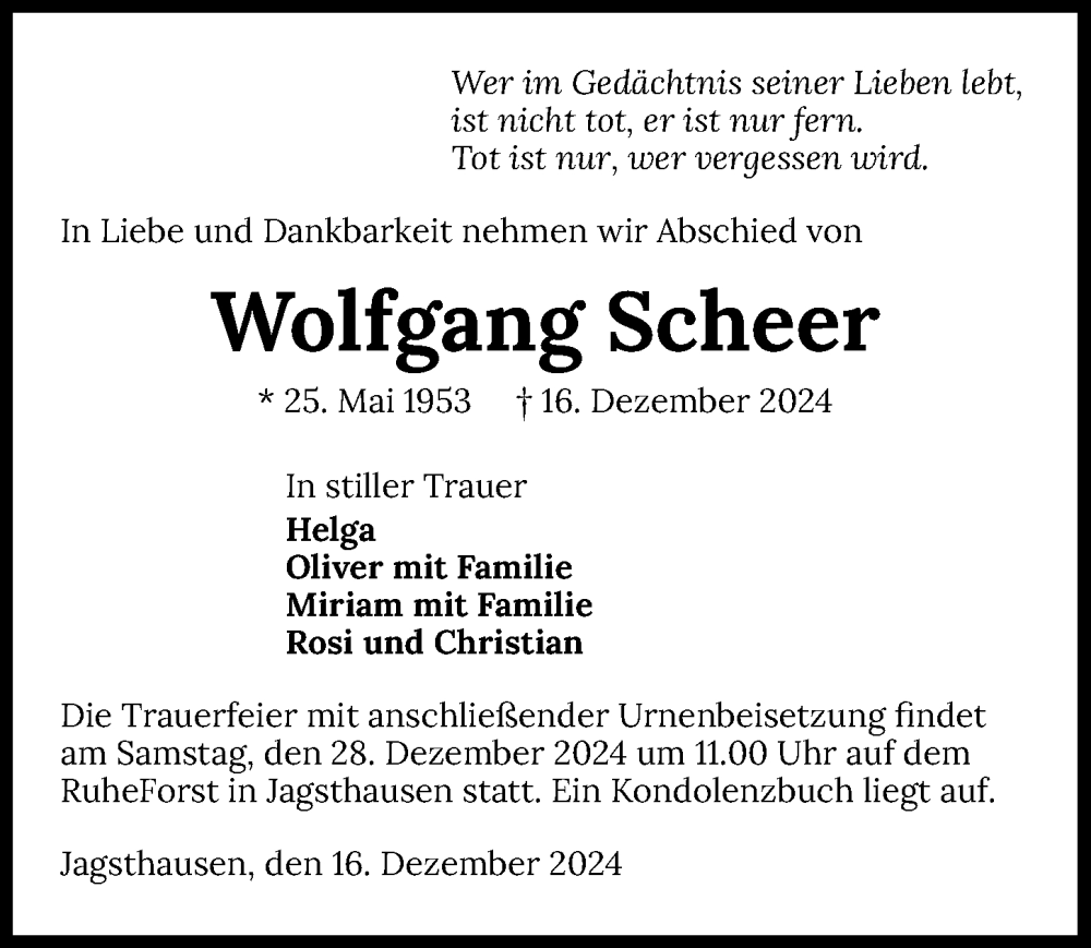 Hier finden Sie alle Traueranzeigen aus der Zeitung, die bisher für Wolfgang Scheer erschienen sind. Weitere Traueranzeigen, die in der Zeitung erscheinen, werden hier ebenfalls aufgelistet